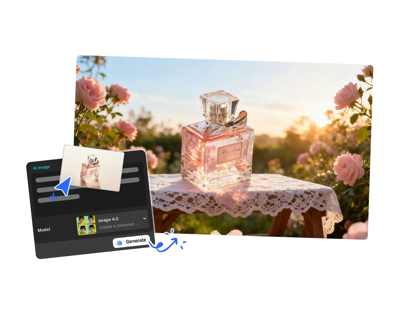 - Blend & Restyle — composite multiple images into one cohesive design.