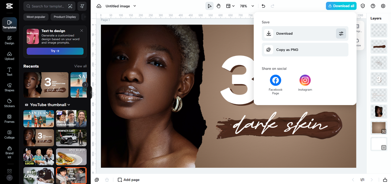 Step 3: Download for campaigns Once complete, click the “Download all” option in the top right corner. Then choose “Download” to customize file size, quality, and format for campaigns. Save it locally or copy as “PNG” for instant use in ads, posts, or presentations.