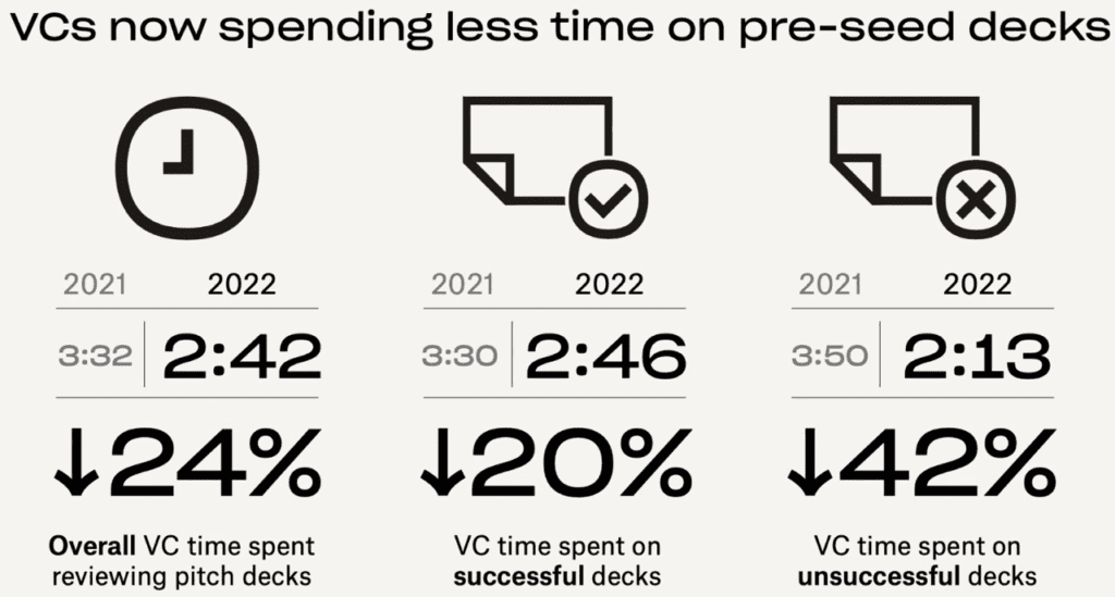 In 2022, investors spend 24% less time looking at pitch decks than in 2021. You have just under three minutes on average to persuade them to meet with you. In fact, investors abandon decks that fail to raise funding in just 2 minutes and 13 seconds. You only have a few seconds to make a good first impression, so make it count.