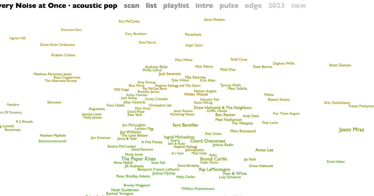 “The project is to understand the communities of listening that exist in the world, figure out what they’re called, what artists are in them and what their audiences are,” creator Glenn McDonald told TechCrunch. “The goal is to use math where you can to find real things that exist in listening patterns. So I think about it as trying to help global music self-organize.”