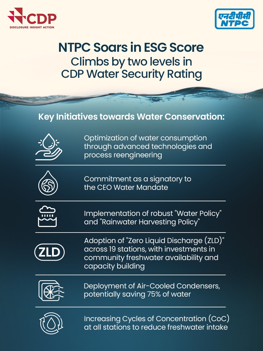 NTPC’s ESG Score has ascended by two levels, transitioning from a ‘D’ rating in 2022 to a commendable ‘C’ rating in 2023, in the Carbon Disclosure Project (CDP) Water Security Rating.