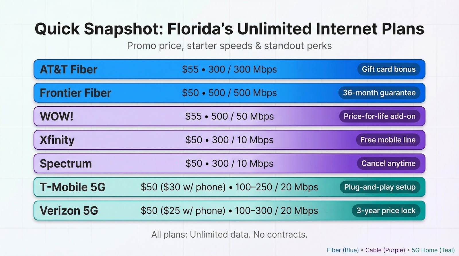 From there, we weighed five signals that matter to Florida households looking for truly unlimited internet plans.