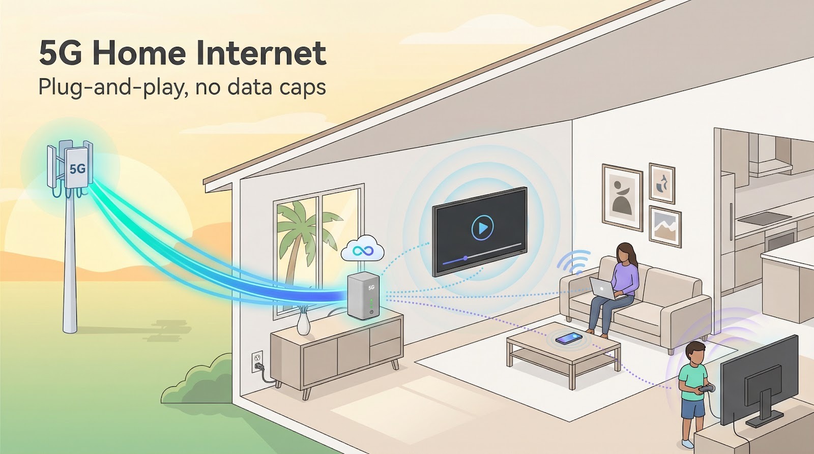 Prefer broadband without a cable truck? T-Mobile ships a small gray gateway; you plug it in, and within ten minutes the whole house rides the same mid-band 5G network that powers your phone.