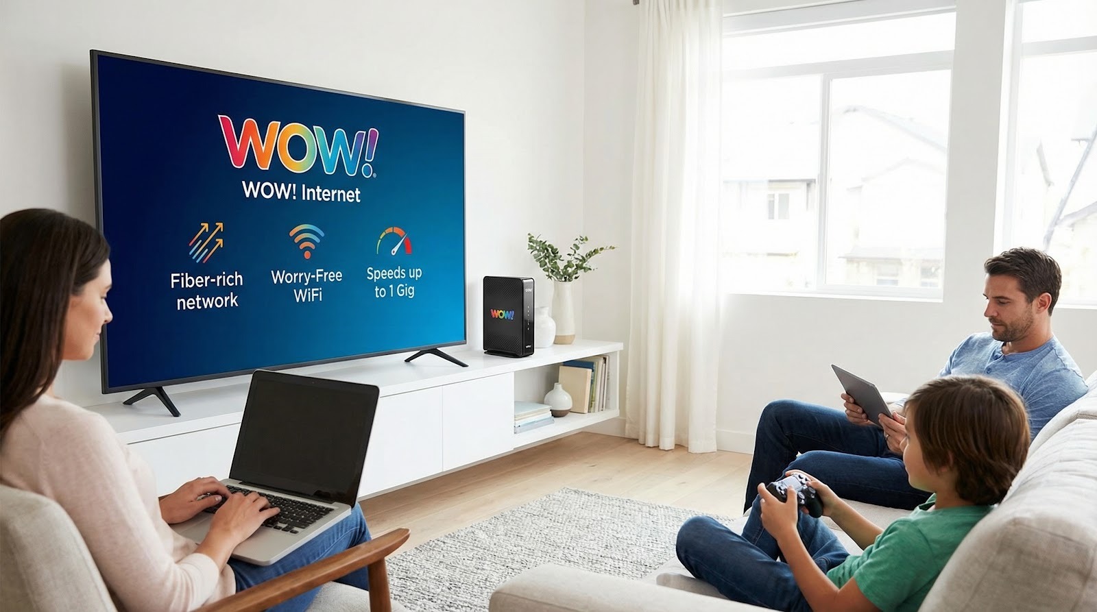 WOW! lifted its data caps on every plan 300 Mbps and above, so the 500 Mbps tier at roughly $55 per month lets your family stream, game, and back up photos without watching a meter. The Wi-Fi gateway is included, quietly saving another ten to fifteen dollars that most cable companies still charge.
