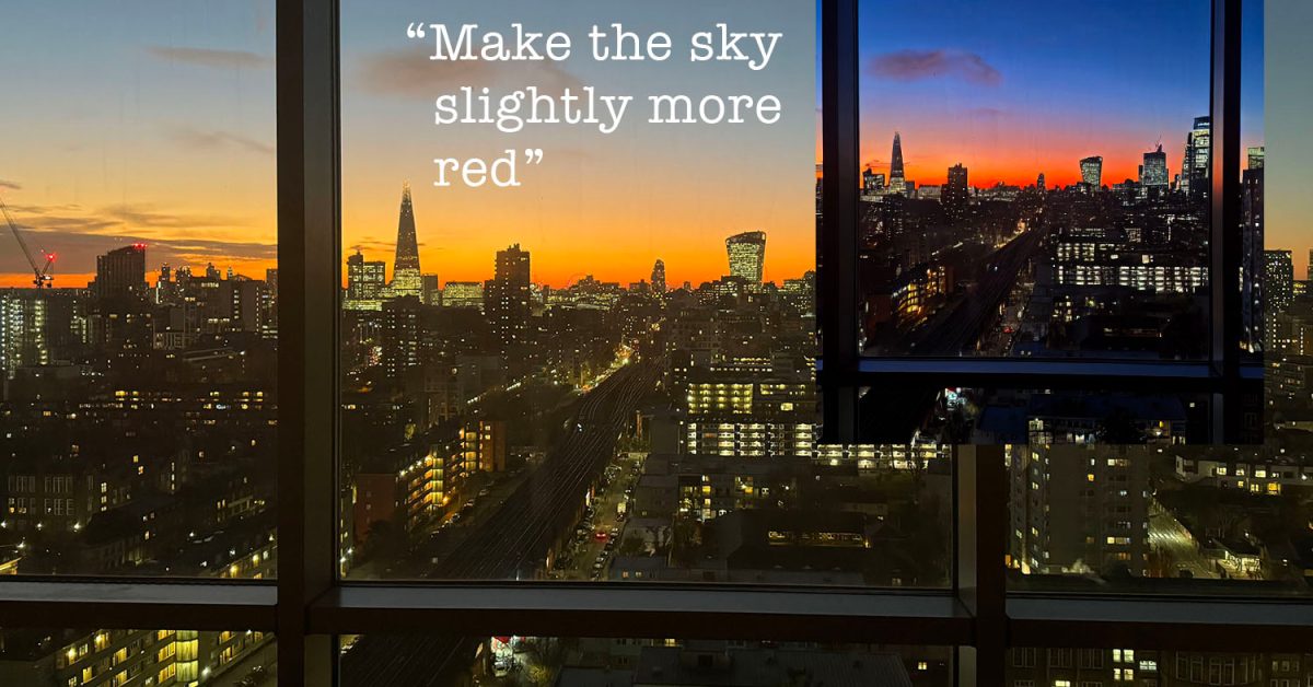 My instruction was “make the sky slightly more red” which MGIE interpreted as “Make the sky in the picture a shade of red rather than a shimmering blue. Make the cityscape a shaded shade instead of a stark white sky.” Here’s the result (which is cropped, for unknown reasons):
