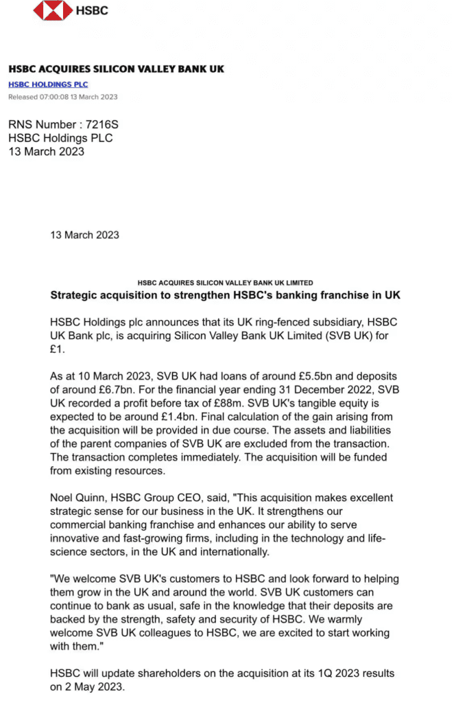 “This acquisition makes excellent strategic sense for our business in the UK,” said Noel Quinn, CEO of HSBC Group. It strengthens our commercial banking franchise and expands our ability to serve innovative and fast-growing businesses, including those in the technology and life sciences sectors, both in the UK and globally. We welcome SVB UK’s customers to HSBC and look forward to assisting them in growing in the UK and globally. Customers of SVB UK can continue to bank as usual, knowing that their deposits are backed by the strength, safety, and security of HSBC. We warmly welcome SVB UK colleagues to HSBC and look forward to working with them.”
