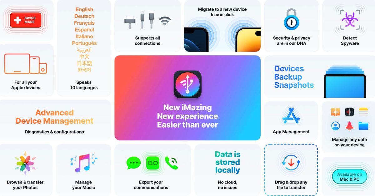 Long considered the standard for local device backups and data transfer between Apple’s mobile device ecosystem and a Mac or Windows PC, iMazing continues to provide innovative solutions for managing Apple mobile devices individually or at scale.