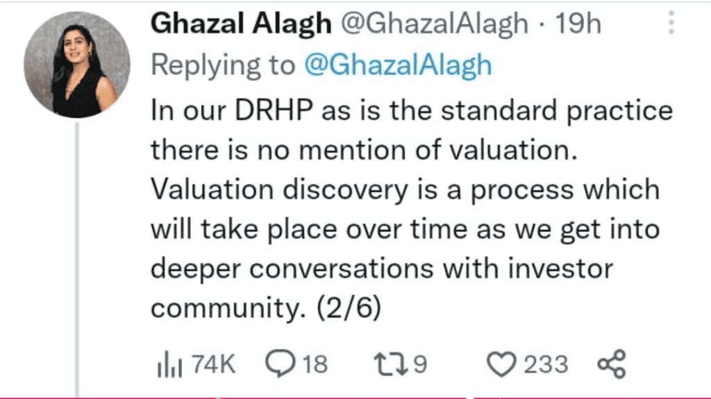 Responding to social media users who expressed concern about the company’s valuation demand, Alagh stated, “In our DRHP, as is standard practise, there is no mention of valuation.” “We have not quoted or subscribe to the valuation numbers that are being mentioned in various posts on social media,” the personal care products startup’s co-founder wrote in a series of tweets. Alagh went on to say, “Valuation discovery is a process that will take place over time as we engage in deeper conversations with the investor community.”