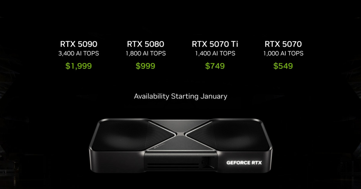 Nvidia CEO Jensen Huang revealed the RTX 50-series GPUs during a CES keynote this evening, announcing a $1,999 RTX 5090, a $999 RTX 5080, a $749 RTX 5070 Ti, and a $549 RTX 5070.